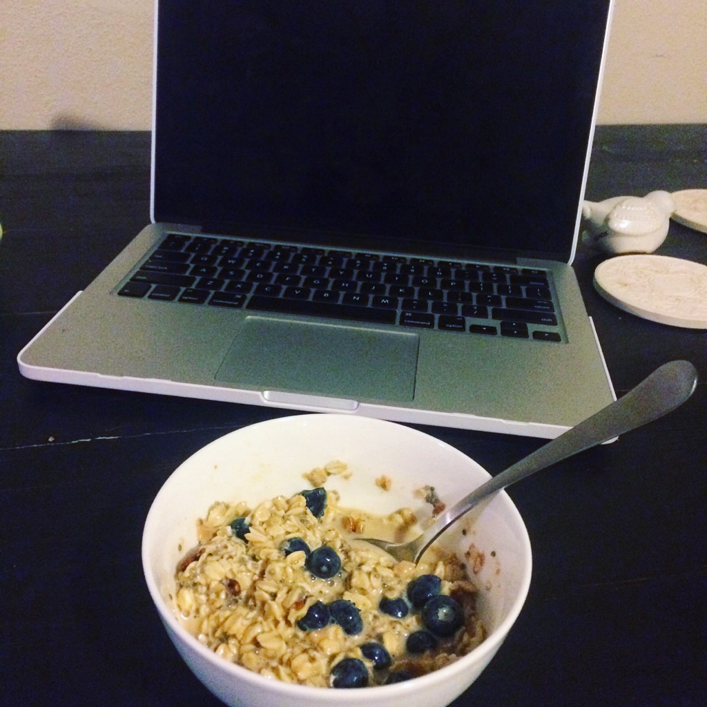 7:35 Ate breakfast-soaked oats and chia seeds in almond milk with pb2, maple syrup, blueberries, and pecans. Not pictured is a turkey and cheese rollup for some protein. 💪🏻